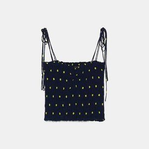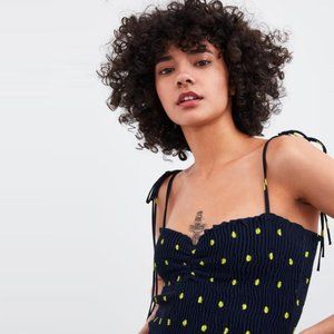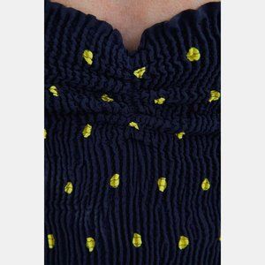 Navy ruched top with lime polka dots. Ruched all over. Long double tie straps at each shoulder