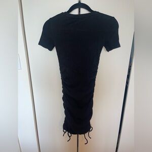 Chic black short dress with ruched detailing on sides with adjustable ties to change length. Perfect for versatile styling.