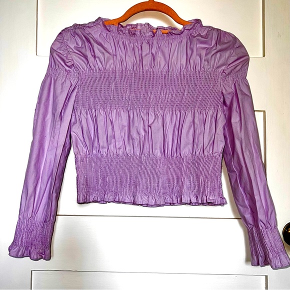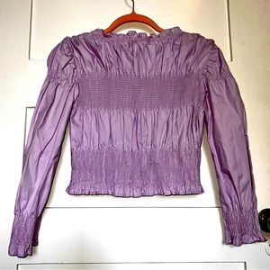 Beautiful lavender ruched top with long sleeves, ruffled boatneck and ruching on bodice and sleeves. Your little fashionista will love it! New without tags, never worn.