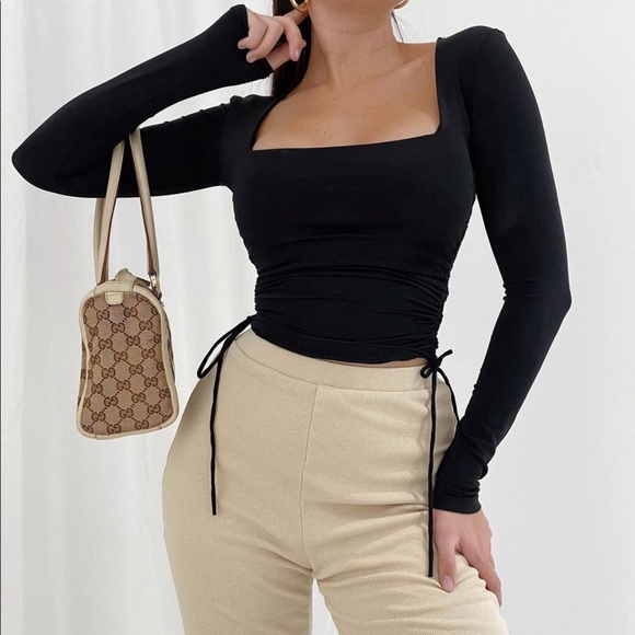Bloggers fav stretchy ruched top with square beck detail!!perfect to dress up or down!!sold out