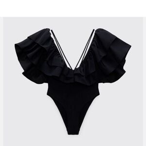 This elegant black ruffled swimsuit is perfect from beach to going out! Its stylish design and comfortable fit make it a must-have in your wardrobe. Worn once.