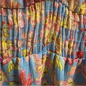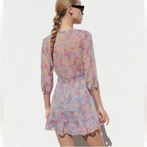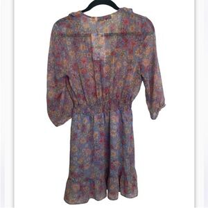 Chic mini dress with vibrant floral pattern. Features ruffled neckline and hem.
