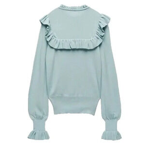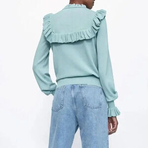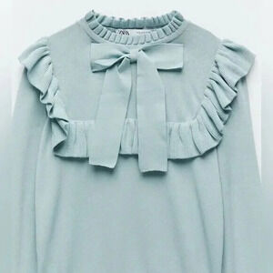 Zara Ruffle Knit Sweater With Bow Womens Size Large Greenish Blue Lightweight