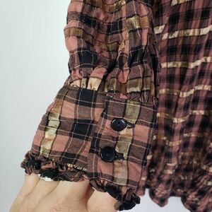 Key features: brown, black and metallic gold plaid, textured fabric, long sleeve, button cuffed, shoulder ruffle detail, ruffle hem, button back