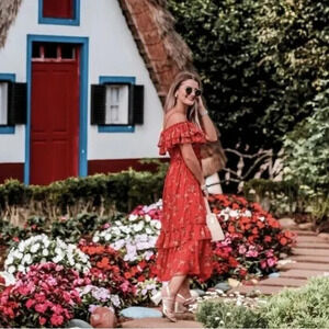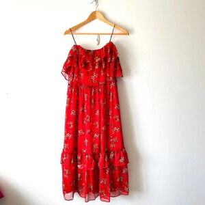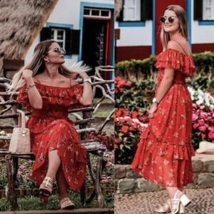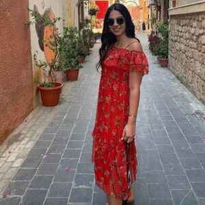 Zara Ruffle Tiered Midi Dress Blogger Fav Red Floral Size Medium