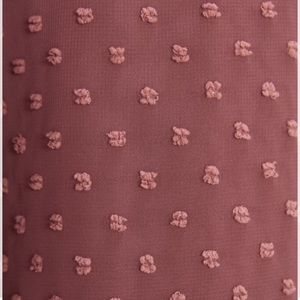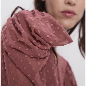 Elegant pink blouse with ruffled sleeves. Textured polka dot design. Perfect for any occasion.