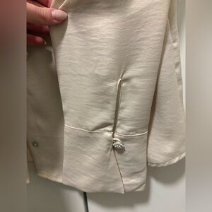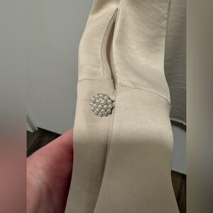 Chic blouse with elegant ruffle detail. Button-up style. Perfect for a polished look. Super pretty! Feels like silk or satin.