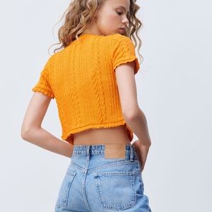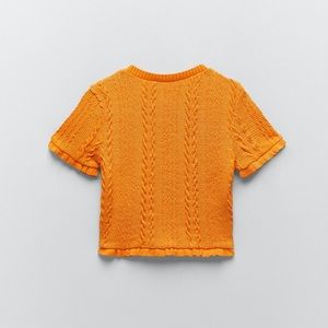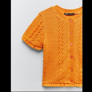- Mini cardigan with round neck and short sleeves with ruffled details.