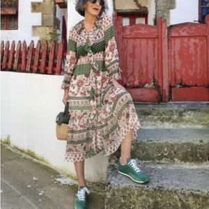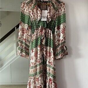 Zara ruffles red and green dress. Drawstring sleeves. Never worn.