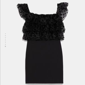 Zara Ruffled Mini Dress, short dress with the off the shoulder straight neckline and short sleeves . Matching ruffles details.back hidden in-seem zip closure.