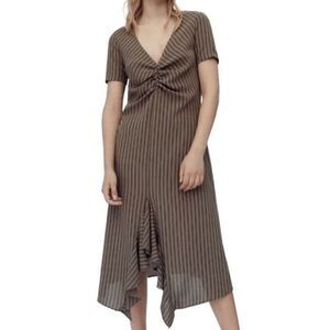 Zara Gathered Dress with Ruffle Trim. Pullover. Short sleeves. V neck. Ruched detail below the neckline. Ruffle detail on the front hem. Lightweight woven fabric. Material: 100% polyester. Vertical stripe pattern all over. Light brown color with black stripes.