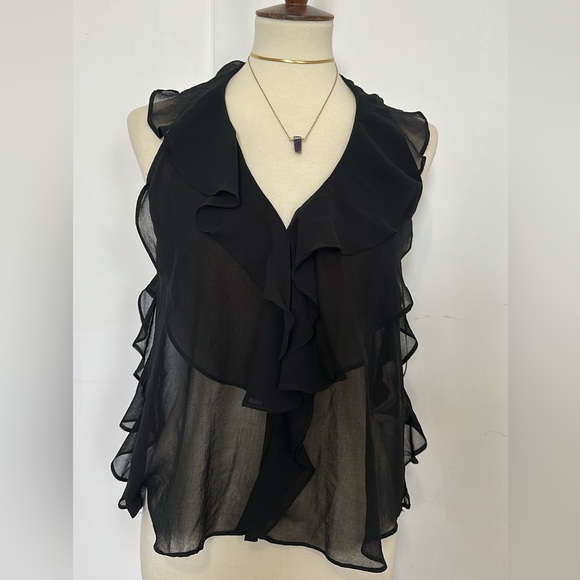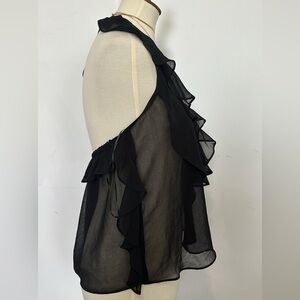 This stylish black sleeveless top features a stylish ruffled design, perfect for any occasion. Its chic and versatile look makes it a must-have in your wardrobe.