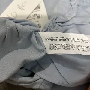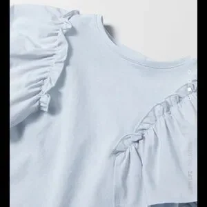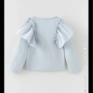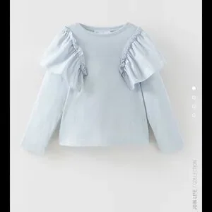 Light blue ruffled poplin top with round neck shirt, long sleeves, matching poplin ruffles, and gathered trim.