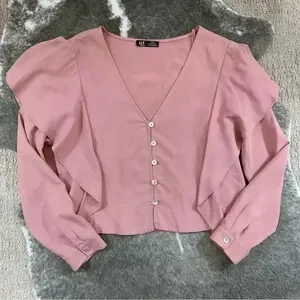 Here’s a gorgeous ruffled detailing top by Zara. Size medium and in great shape. Love the dusty rose color pink. Soft and comfy and perfect for everyday wear! :)