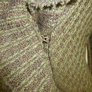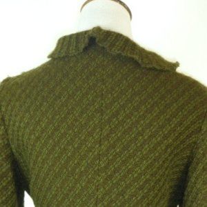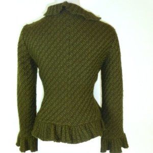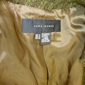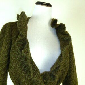 a beautiful ZARA RUFFLE JACKET ..SIZE MEDIUM..75% wool, 25% nylon..textured boucle type fabric that has a blend of olive green and brown..shows as a mild stripe..almost a solid..hook and eye closure ..just BEAUTIFUL