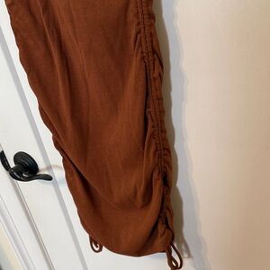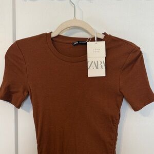 Chic brown midi dress with ruched detailing. Short sleeves and fitted silhouette. Perfect for versatile styling.