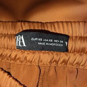 The Zara Women's Pant in XS is a stylish and comfortable dress pant made of satin fabric in a trendy brown color. It features a wide-leg design with a high-rise waist and elastic waist closure, making it perfect for a casual cocktail occasion. The adjustable waist adds convenience, while the strap accents provide a unique touch to the overall look. Ideal for summer, fall, and spring, these pants are a versatile addition to any woman's wardrobe. Easy to care for with machine washable instructions, these pants from Zara are a must-have for those looking for a bohemian, city-inspired style with a touch of metal accents.
