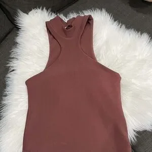 Form-fitting ribbed halter top by Zara. Deep rust-brown tone with textured knit. Versatile staple for layered looks.