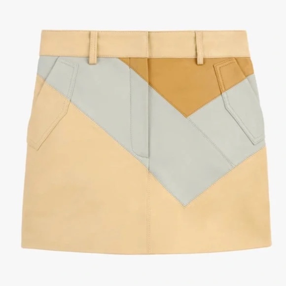 Zara SRPLS Patchwork Skirt. High-waisted mini leather skirt. Side pockets and back welt pockets. Contrasting panels. Runway Collection. Made from 100% Join Life Tanned Leather. Size Large. NWT new with tags and never worn.