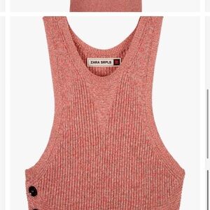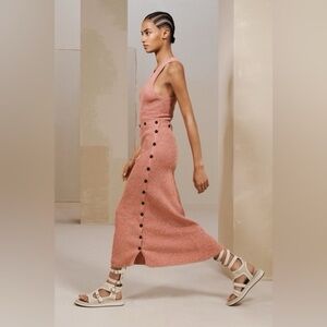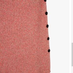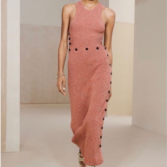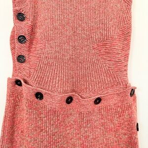 Super flattering ribbed sleeveless dress in a coral red with a hint of heather gray throughout. Features black button detailing up the sides and waist.