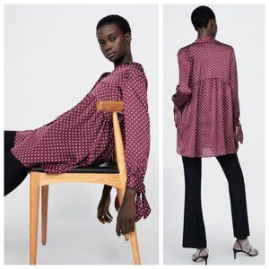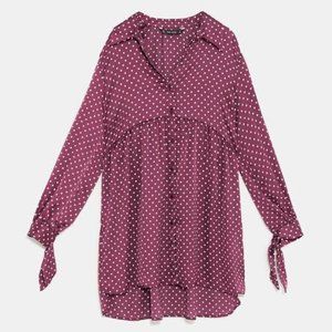 Zara Satin Burgundy Red & White Polka Dot Button Down Long Sleeve Tunic Top