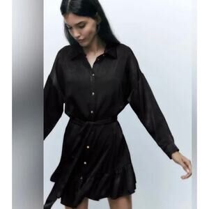 Zara Satin Effect Black Button Down Ruffle Belted Long Sleeve Shirt Dress Small