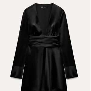Dress Runs Small!! XL fits like L. Dress made of satin effect fabric. V-neck and long cuffed sleeves. Ruching at waist. Hidden in-seam zip closure. Black| 4764/245 Outer shell and lining 100% polyester. Only worn one time and dry cleaned. Adorable, lots of complements but just don't have a need to wear again.
