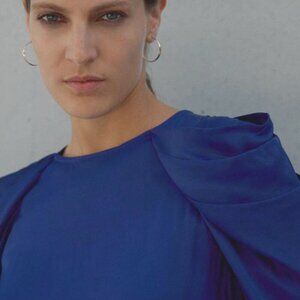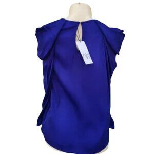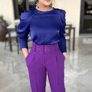 New With Tags | Zara Satin Effect Pleated Puff Shoulder Glossy Long Sleeve Blouse | Royal Blue/Purple | XS