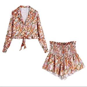 Zara Satin Effect Printed Set Ecru Orange XS Culottes Johnny Collar Crop