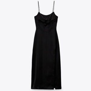 Zara Satin Elegant Black Evening Midi Dress. This elegant black evening dress is perfect for any formal occasion. Its sleek design and sophisticated style make it a must-have in your wardrobe.