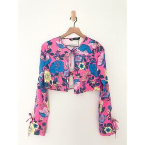 Zara Satin Floral Flyaway Tie Front Top XS Pink Cropped Long Bell Sleeve