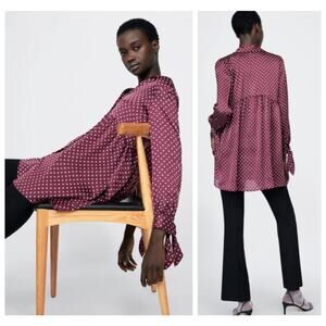 Zara Satin Polka Dot Button Up Tunic Top XS Burgundy Hi Low Tie Sleeve