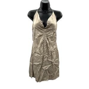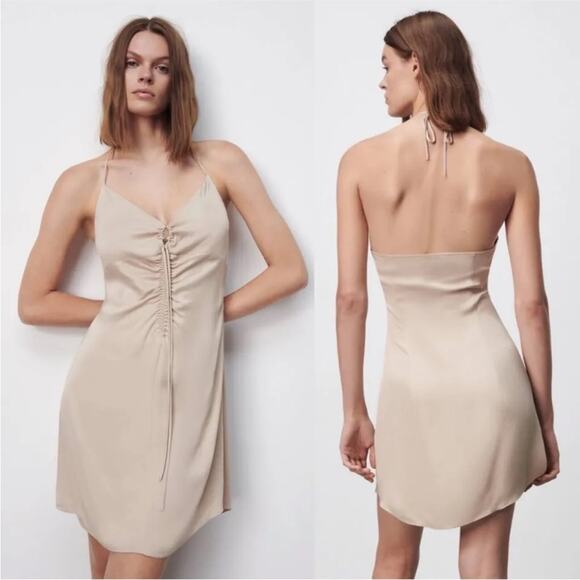 Zara Satin Ruched Beige Halter Tie Shift Mini Slip Dress Size M NWT