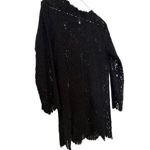 This Zara lace blouse in black features a delicate sheer lace construction with scalloped edges and a high neckline trimmed for added elegance. Designed with quarter sleeves and an unlined silhouette, it offers a light, airy feel, while the keyhole back with button closure adds a subtle, stylish detail. Perfect for layering or wearing on its own for a chic, sophisticated look.