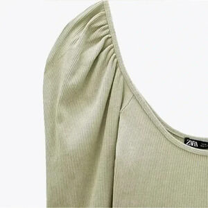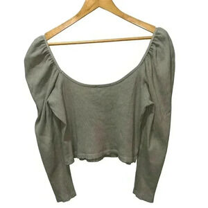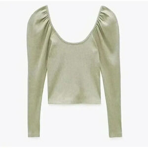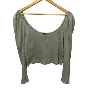 Zara Scoop Neck Puff Shoulder Long Sleeve Crop Top Size Large Green Casual
