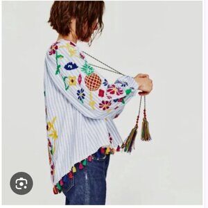 Zara Seersucker Floral Embroidered Striped Pineapple Peasant Top with Tassels