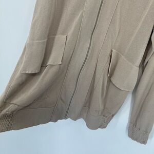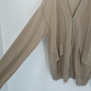 Full zip bomber jacket with a slight sheer. Front large pockets.