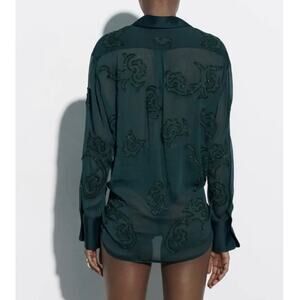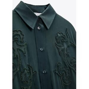 Zara Semi-Sheer Collared Button-Up Blouse Tonal Bead Applique Forest Green Small