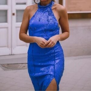 Zara Sequin Midi Maxi Dress Womens Size Small S Blue Sparkly Bodycon Evening