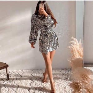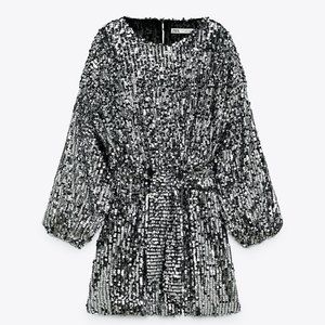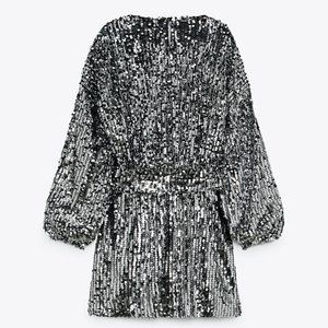Round neck dress with long sleeves with elastic cuffs. Elastic waistband and tied self-belt. Sequin appliqué. Back opening with button closure.