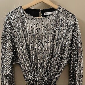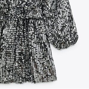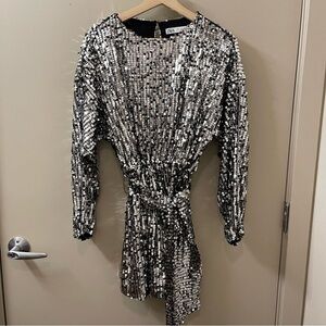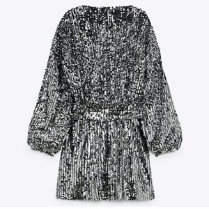 Zara Sequin long sleeve belted Mini Dress Silver size small Bloggers favorite
