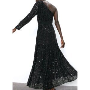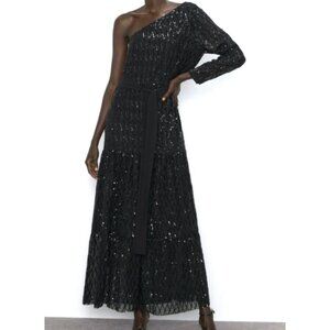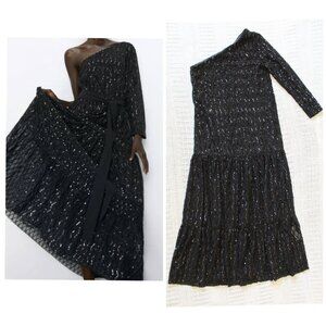 Zara Sequins Black Maxi Dress One Sleeve Tiered Size XS Sparkle maximalist