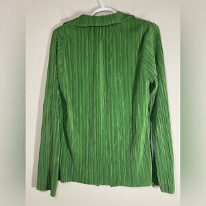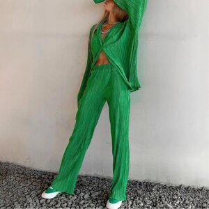 This elegant Zara set in a rich green color showcases a collared design with long sleeves and a defined waistline. The wide-leg pants provide a flowing and relaxed fit, perfect for professional or dressy casual occasions.
