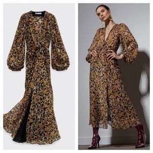 Make a statement at your next wedding or cocktail event with this stunning Zara gown. Featuring a dramatic plunge neckline and voluminous bishop sleeves, this dress combines elegance with a touch of boldness. The flowing skirt and classic leopard print in brown and black create a timeless and sophisticated look.