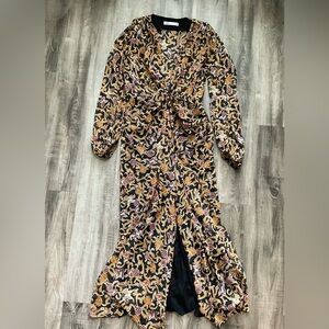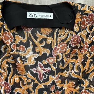 Zara Sheer Floral Printed Maxi Dress Medium Metallic Knot Front Long Sleeve