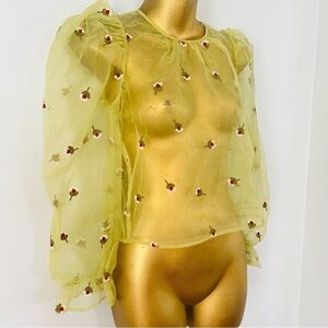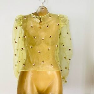 Zara Sheer Floral Puff Sleeve Top XS | Pistachio Green Romantic Euro Chic