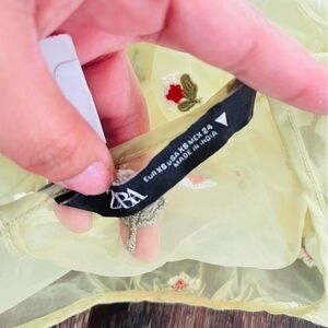 Delicate and dreamy, this Zara sheer floral puff sleeve top captures the essence of European summer romance. Featuring embroidered mini flowers and voluminous sleeves, this pistachio green blouse is perfect for layering with a lace bralette or cami. Ideal for brunch dates, garden parties, or summer festivals, it adds a touch of effortless charm and femininity to any outfit.