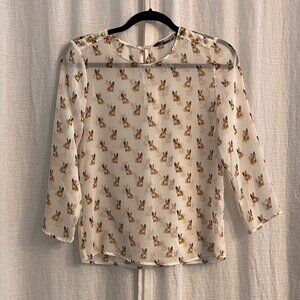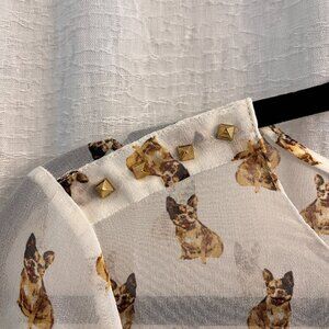 - Style: Sheer 3/4 length-sleeved blouse with frenchie print, studded accents on shoulders, and a button clasp in the back
