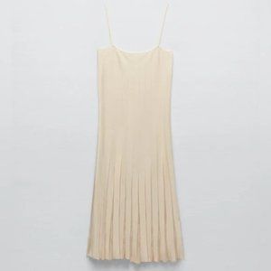 Straight neck midi dress with spaghetti straps. Combination semi-sheer fabric hem.