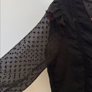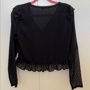 Chic black blouse with sheer sleeves. Features ruffled accents and a v-neckline. Perfect for versatile styling with a blazer and can be dressed up or down.